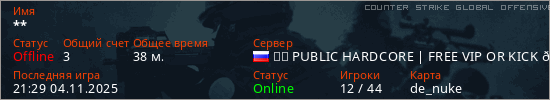 Играет на Counter Strike Global Offensive сервере. Страна: РоссияПервый раз замечен 01:49 29.07.2025