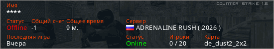 Играет на Counter Strike 1.6 сервере. Страна: РоссияПервый раз замечен 16:58 03.02.2026