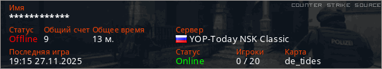 Играет на Counter Strike Source сервере. Страна: РоссияПервый раз замечен 18:11 25.11.2025