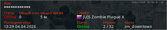 Играет на Counter Strike 1.6 сервере. Страна: РоссияПервый раз замечен 13:26 04.04.2026