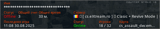Играет на Counter Strike 1.6 сервере. Страна: РумынияПервый раз замечен 15:47 27.10.2024