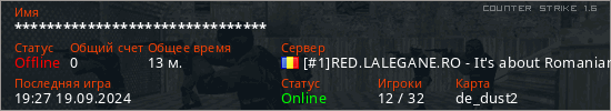 Играет на Counter Strike 1.6 сервере. Страна: РумынияПервый раз замечен 19:23 21.07.2024