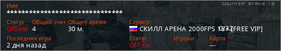 Играет на Counter Strike 1.6 сервере. Страна: РоссияПервый раз замечен 09:03 20.01.2026