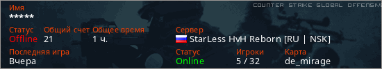 Играет на Counter Strike Global Offensive сервере. Страна: РоссияПервый раз замечен 08:00 15.02.2026