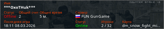 Играет на Counter Strike 1.6 сервере. Страна: РоссияПервый раз замечен 18:09 08.03.2026