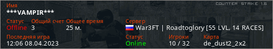 Играет на Counter Strike 1.6 сервере. Страна: РоссияПервый раз замечен 19:26 23.02.2023