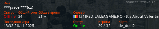 Играет на Counter Strike 1.6 сервере. Страна: РумынияПервый раз замечен 13:00 21.11.2025