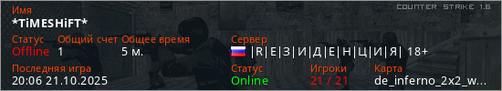 Играет на Counter Strike 1.6 сервере. Страна: РоссияПервый раз замечен 20:04 21.10.2025