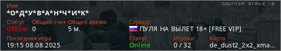 Играет на Counter Strike 1.6 сервере. Страна: РоссияПервый раз замечен 19:13 08.08.2025