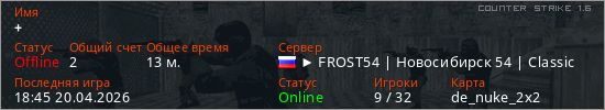 Играет на Counter Strike 1.6 сервере. Страна: РоссияПервый раз замечен 14:00 19.04.2026