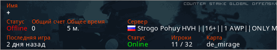 Играет на Counter Strike Global Offensive сервере. Страна: РоссияПервый раз замечен 18:32 21.12.2025