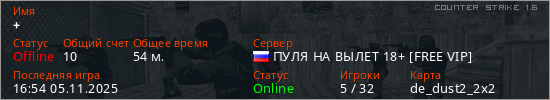 Играет на Counter Strike 1.6 сервере. Страна: РоссияПервый раз замечен 12:00 11.07.2025