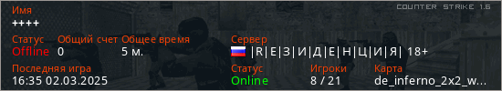 Играет на Counter Strike 1.6 сервере. Страна: РоссияПервый раз замечен 16:33 02.03.2025