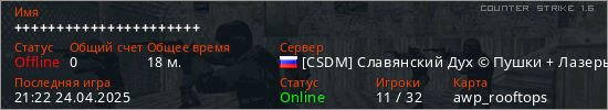 Играет на Counter Strike 1.6 сервере. Страна: РоссияПервый раз замечен 20:52 23.04.2025