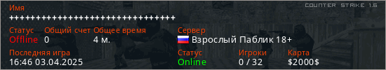 Играет на Counter Strike 1.6 сервере. Страна: РоссияПервый раз замечен 16:42 03.04.2025