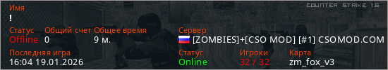 Играет на Counter Strike 1.6 сервере. Страна: РоссияПервый раз замечен 17:14 15.01.2026