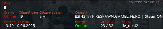 Играет на Counter Strike 1.6 сервере. Страна: СШАПервый раз замечен 16:39 05.06.2025