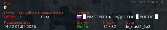 Играет на Counter Strike 1.6 сервере. Страна: РоссияПервый раз замечен 14:31 01.04.2026