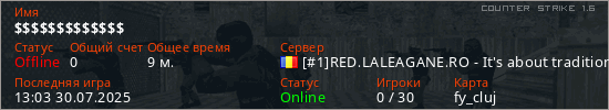 Играет на Counter Strike 1.6 сервере. Страна: РумынияПервый раз замечен 00:38 28.04.2024