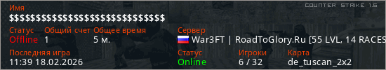 Играет на Counter Strike 1.6 сервере. Страна: РоссияПервый раз замечен 11:35 18.02.2026