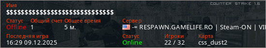 Играет на Counter Strike 1.6 сервере. Страна: СШАПервый раз замечен 16:18 09.12.2025
