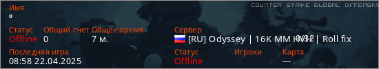 Играет на Counter Strike Global Offensive сервере. Страна: РоссияПервый раз замечен 16:15 21.04.2025