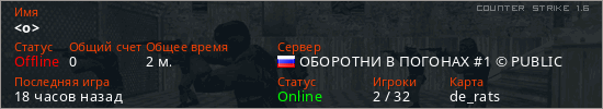 Играет на Counter Strike 1.6 сервере. Страна: РоссияПервый раз замечен 12:50 13.02.2026