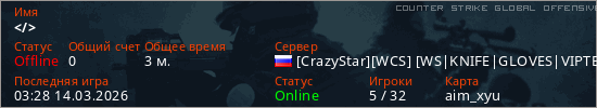 Играет на Counter Strike Global Offensive сервере. Страна: РоссияПервый раз замечен 03:28 14.03.2026