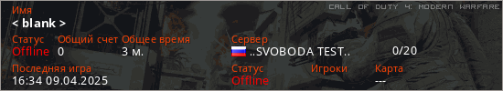 Играет на Call of Duty 4: Modern Warfare сервере. Страна: РоссияПервый раз замечен 16:34 09.04.2025