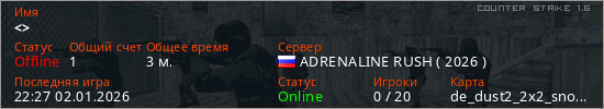 Играет на Counter Strike 1.6 сервере. Страна: РоссияПервый раз замечен 22:27 02.01.2026