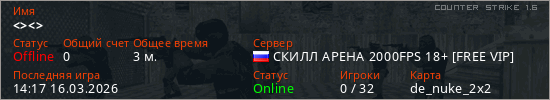 Играет на Counter Strike 1.6 сервере. Страна: РоссияПервый раз замечен 14:17 16.03.2026