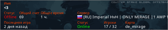 Играет на Counter Strike Global Offensive сервере. Страна: РоссияПервый раз замечен 20:09 09.08.2025