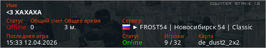 Играет на Counter Strike 1.6 сервере. Страна: РоссияПервый раз замечен 15:33 12.04.2026