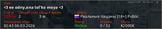 Играет на Counter Strike 1.6 сервере. Страна: РоссияПервый раз замечен 02:43 06.03.2026