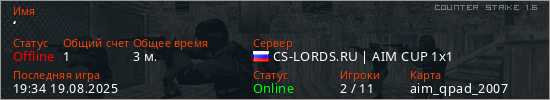 Играет на Counter Strike 1.6 сервере. Страна: РоссияПервый раз замечен 19:34 19.08.2025