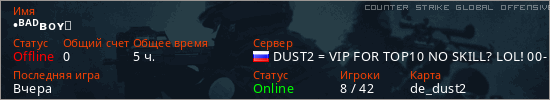 Играет на Counter Strike Global Offensive сервере. Страна: РоссияПервый раз замечен 20:09 28.03.2025