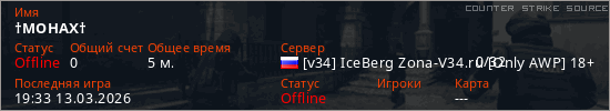 Играет на Counter Strike Source сервере. Страна: РоссияПервый раз замечен 18:42 07.03.2026