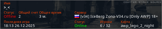 Играет на Counter Strike Source сервере. Страна: РоссияПервый раз замечен 18:13 26.12.2025