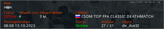 Играет на Counter Strike 1.6 сервере. Страна: РоссияПервый раз замечен 08:08 15.10.2023