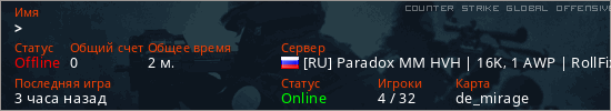 Играет на Counter Strike Global Offensive сервере. Страна: РоссияПервый раз замечен 18:30 31.01.2026