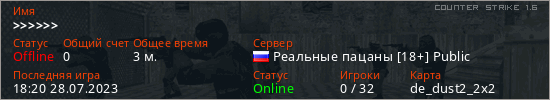 Играет на Counter Strike 1.6 сервере. Страна: РоссияПервый раз замечен 18:20 28.07.2023