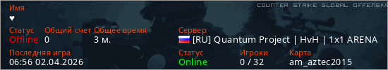 Играет на Counter Strike Global Offensive сервере. Страна: РоссияПервый раз замечен 06:56 02.04.2026