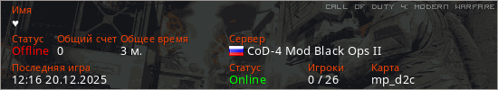 Играет на Call of Duty 4: Modern Warfare сервере. Страна: РоссияПервый раз замечен 12:16 20.12.2025