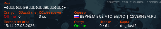 Играет на Counter Strike Global Offensive сервере. Страна: РоссияПервый раз замечен 15:14 27.03.2026