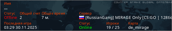 Играет на Counter Strike Global Offensive сервере. Страна: РоссияПервый раз замечен 22:23 20.04.2025