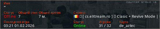 Играет на Counter Strike 1.6 сервере. Страна: РумынияПервый раз замечен 19:20 31.01.2026
