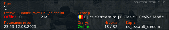 Играет на Counter Strike 1.6 сервере. Страна: РумынияПервый раз замечен 23:53 12.08.2025