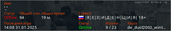 Играет на Counter Strike 1.6 сервере. Страна: РоссияПервый раз замечен 13:49 31.01.2025