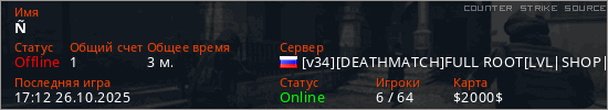 Играет на Counter Strike Source сервере. Страна: РоссияПервый раз замечен 17:12 26.10.2025