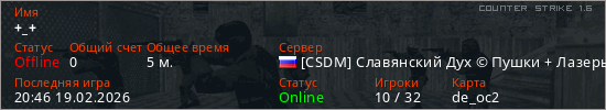 Играет на Counter Strike 1.6 сервере. Страна: РоссияПервый раз замечен 20:36 19.02.2026